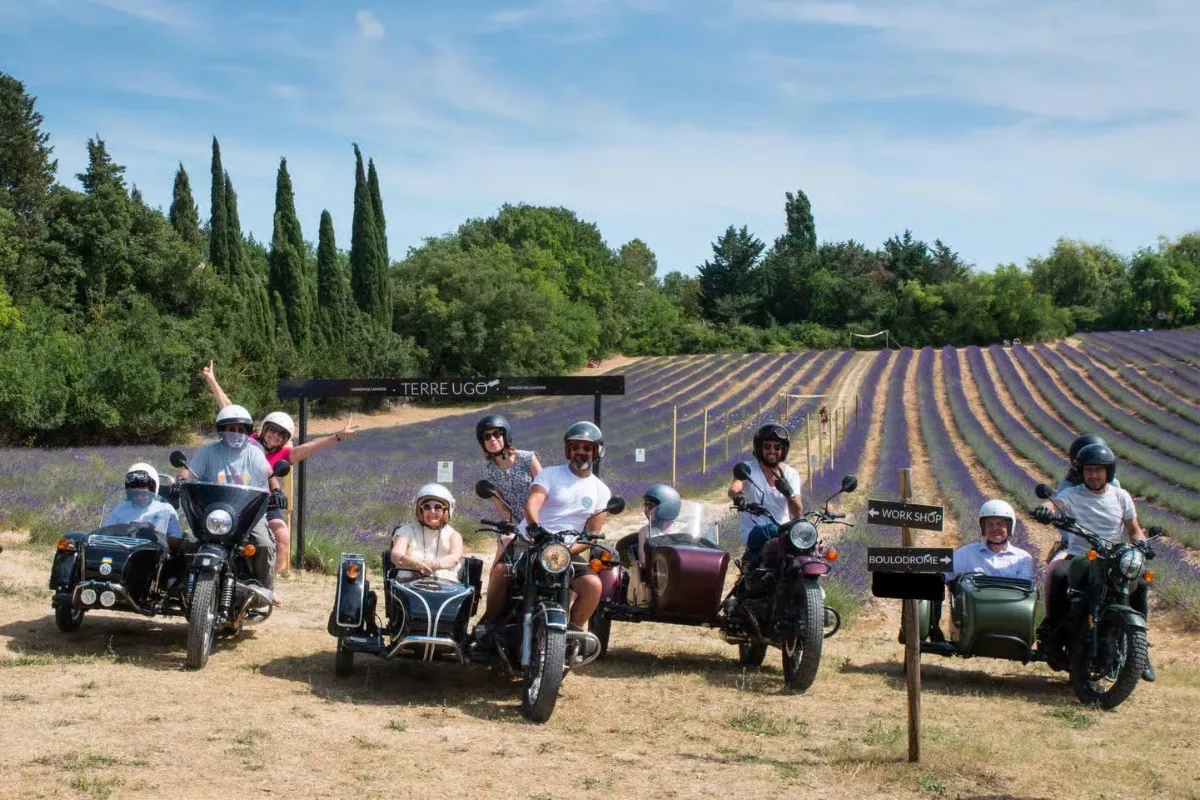 Traversez les champs de lavande à bord d’un side-car vintage emblématique.